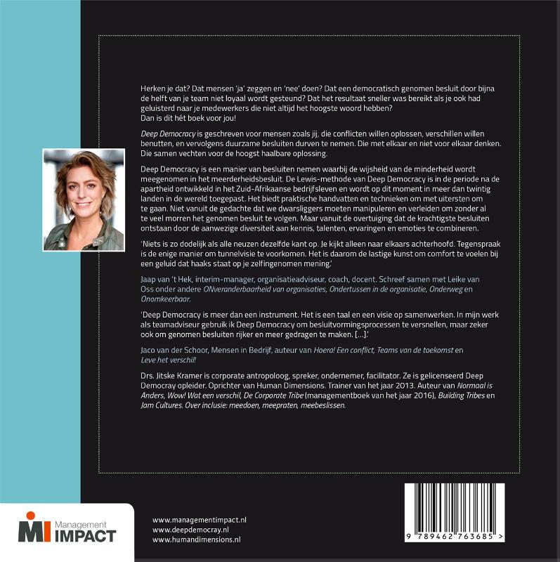 In mijn werk als teamadviseur gebruik ik Deep Democracy om besluitvormingsprocessen te versnellen, maar zeker ook om genomen besluiten rijker en meer gedragen te maken. [...].' Jaco van der Schoor, Mensen in Bedrijf, auteur van 'Hoera! Een conflict', 'Teams van de toekomst' en 'Leve het verschil!'