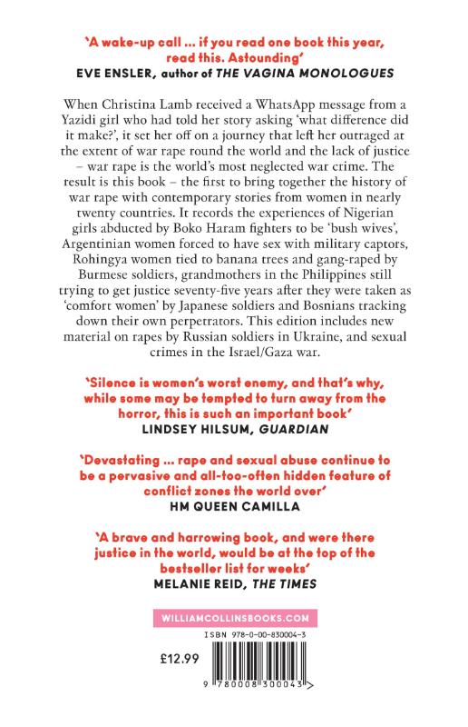 Speaking to survivors first-hand, Lamb encounters the suffering and bravery of women in war and meets those fighting for justice. From Southeast Asia where ‘comfort women’ were enslaved by the Japanese during World War Two to the Rwandan genocide, when an estimated quarter of a million women were raped, to the Yazidi women and children of today who witnessed the mass murder of their families before being enslaved by ISIS. Along the way Lamb uncovers incredible stories of heroism and resistance, including the Bosnian women who have hunted down more than a hundred war criminals, the Aleppo beekeeper rescuing Yazidis and the Congolese doctor who has risked his life to treat more rape victims than anyone else on earth.